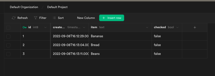 shopping_list, and the table has anitemcolumn withtextcontent and acheckedcolumn withboolcontent. Thecheckedcolumn also has a default value offalse. This is in addition to the default columns,idandcreated_at.You should now be on the page for the table, and can input new rows of data using the + Insert row button.